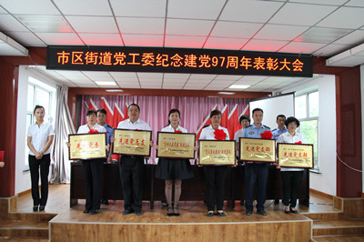 为喜迎中国共产党第97个生日,6月29日下午,市区街道党工委召开庆祝建党97周年暨“七一”表彰大会,以崇高的敬意向党的生日献礼。街区全体党员、辖区派出所党支部、“两新”党总支、居民党员代表等百余人出席此次会议。